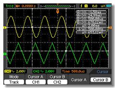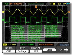 Auto Measuerment Frequency, Period, Mean, Pk-Pk, Cycli RMS, Minimum, Maximum, Rise time, Fall Time, +Pulse Width, -Pulse Width, Delay1-2Rise, Delay1-2Fall, +Duty, -Duty, Vbase, Vtop, Vmid, Vamp, Overshoot, Preshoot, Preiod Mean, Preiod RMS, FOVShoot, RPREShoot